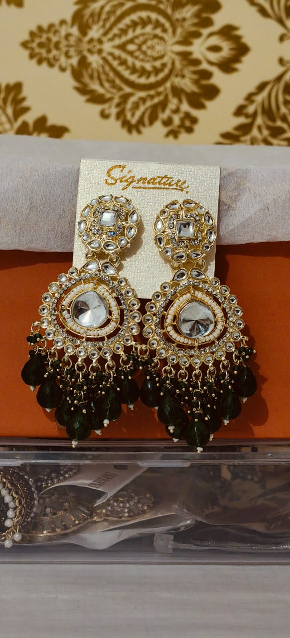 Green Pearl Drop Kundan Jhumka Earrings